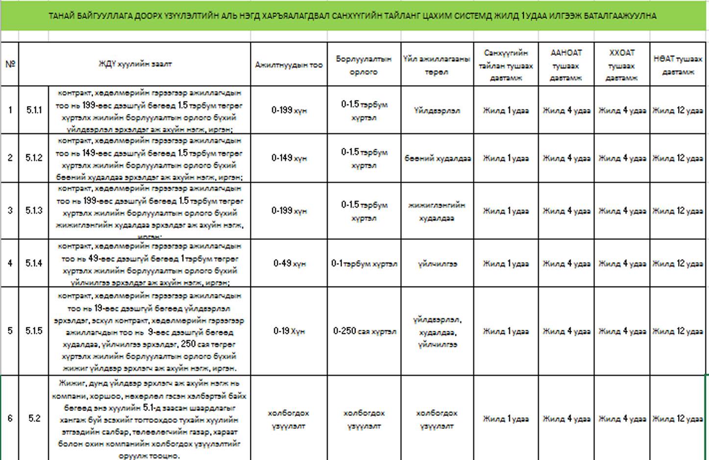 2015оны 06 дугаар сарын 19-ний өдөр “НЯГТЛАН БОДОХ БҮРТГЭЛИЙН ТУХАЙ ХУУЛЬ”шинэчлэгдэн батлагдаж 2016.01.01-ний өдрөөс эхлэн мөрдөж байгаа билээ. Уг хуулиар санхүүгийн тайлан гаргаж тушаах хугацааг уртасгаж, жижиг дунд аж ахуй нэгжийг жилд 1 удаа гаргахаар болсон. Өөрөөр хэлбэл танай байгууллага “ЖИЖИГ ДУНД ҮЙЛДВЭРИЙН ТУХАЙ ХУУЛЬ”-ийн5.1.1-5.2-т заасан үзүүлэлтэд багтаж байвал доорх хүснэгтийн дагуу санхүү, татварын тайлангаа гаргаж баталгаажуулах юм.