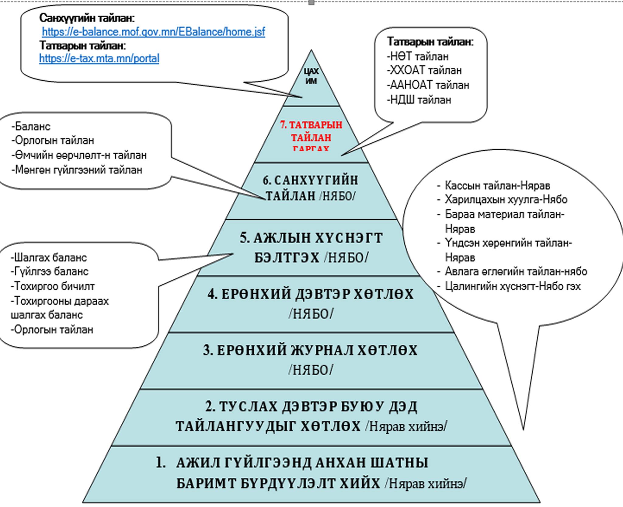 Зарим нэг санхүүгийн ажилтнууддаа сануулах үүднээс санхүү, татварын тайлан гаргах үе шатыг доорх хүснэгтээр харуулъя.