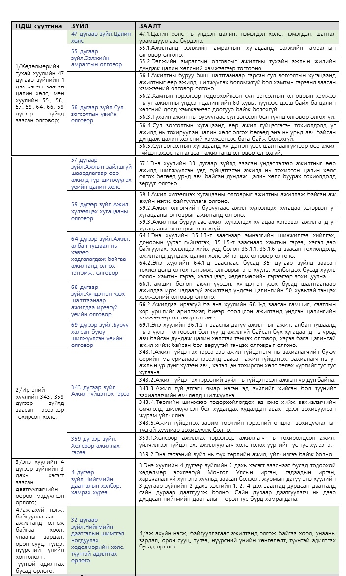 - Хөдөлмөрийн тухай хуулийн 47 дугаар зүйлийн 1 дэх хэсэгт заасан цалин хөлс, мөн хуулийн 55, 56, 57, 59, 64, 66, 69 дүгээр зүйлд заасан олговор;