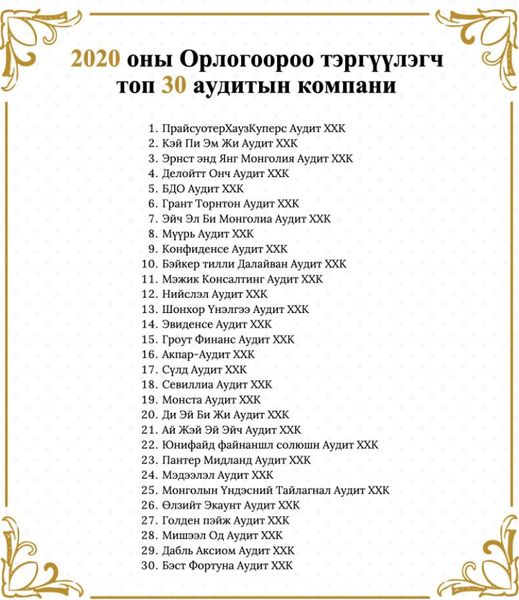 Монголын Мэргэшсэн Нягтлан Бодогчдын Институтээс жил бүр Монгол улсад үйл ажиллагаа явуулж байгаа 130 гаруй аудитын компаниудаас Орлогоороо тэргүүлэгч 30 компанийг шалгаруулдаг билээ. Мэжик Консалтинг Аудит ХХК нь 2020 оны үзүүлэлтээр 11-т жагссан байна. Эхний 10 компаниудын 9 нь Олон улсын сүлжээ аудитын компаниуд юм.