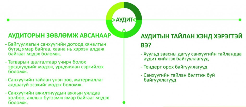 Аудитын үйлчилгээ нь шийдвэр гаргагчийг үнэн зөв мэдээллээр хангахын тулд санхүүгийн тайлангийн итгэлтэй, найдвартай, ач холбогдолтой байдлыг үнэлэх хараат бус мэргэжлийн үйлчилгээ юм. Өөрөөр хэлбэл Аудит бол тухайн байгууллагын хөрөнгийг хамгаалах эцсийн шатны хамгаалалт юм.